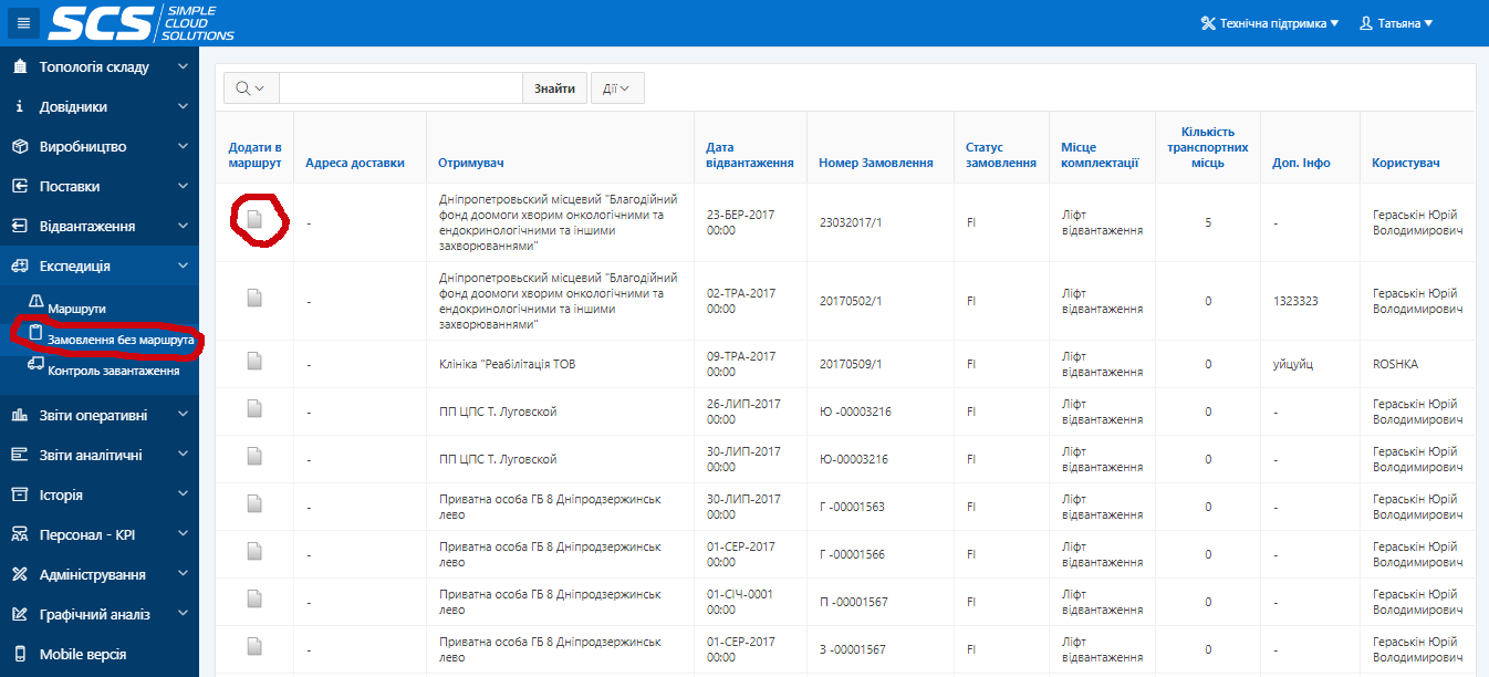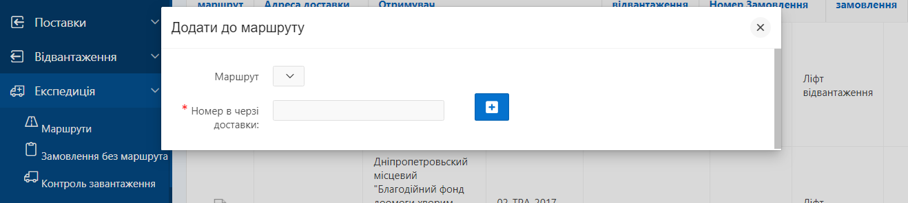 При натисканні кнопки додати в маршрут – у вікні, що відкрилось, обираємо маршрут зі списку активних та вказуємо номер у черзі доставки. Номер вказати необхідно обов'язково для контролю завантаження.