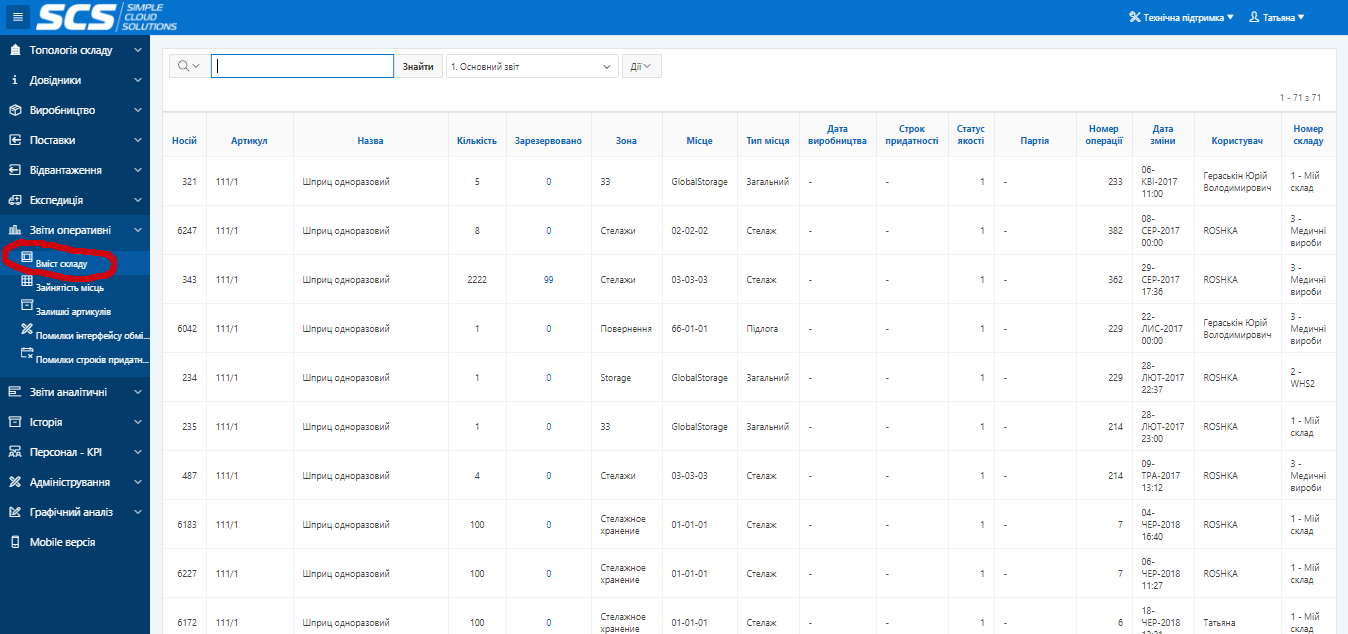 Основний звіт по усим позиціям та адресам їх знаходження на складі в поточний момент в режимі on-line.