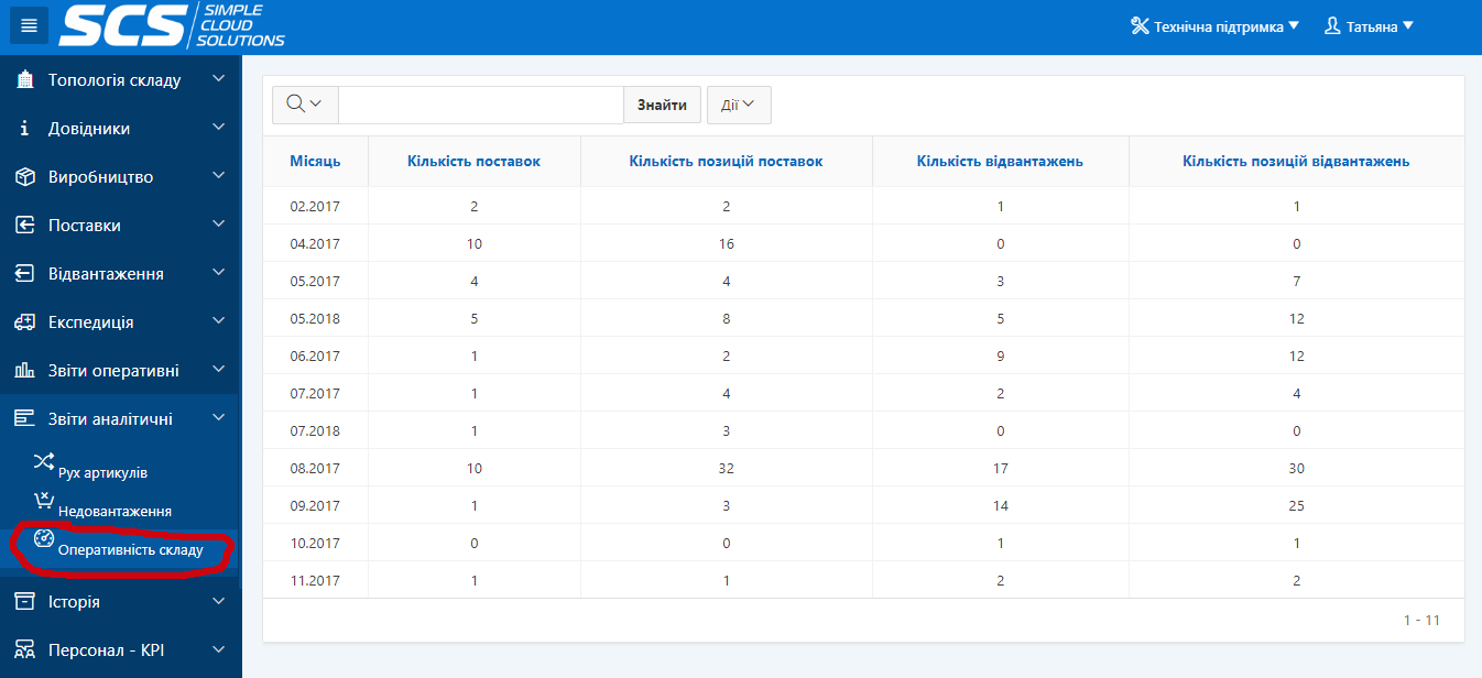 Дозволяє оцінити загальне навантаження за кількістю, оброблених складом, замовлень та позицій на прихід-відвантаження товару.